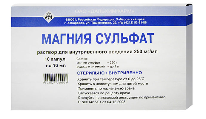 Препарат в медицине называется сульфатом магния. Этот препарат часто используется специалистами в качестве первой помощи при лечении повышенного артериального давления. Магнезия относится к препаратам, с помощью которых можно получить немедленный эффект и нормализовать состояние пациента.