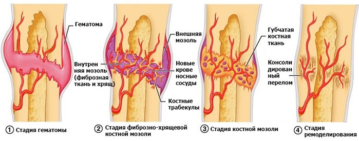• Четвертый этап. На этом этапе нарушенное кровообращение стабилизируется, а значит, костный мозг начинает восстанавливаться.питаются до необходимой степени. В результате этого процесса восстанавливается прочная костная ткань. Эта стадия может длиться 1-2,5 месяца после перелома.